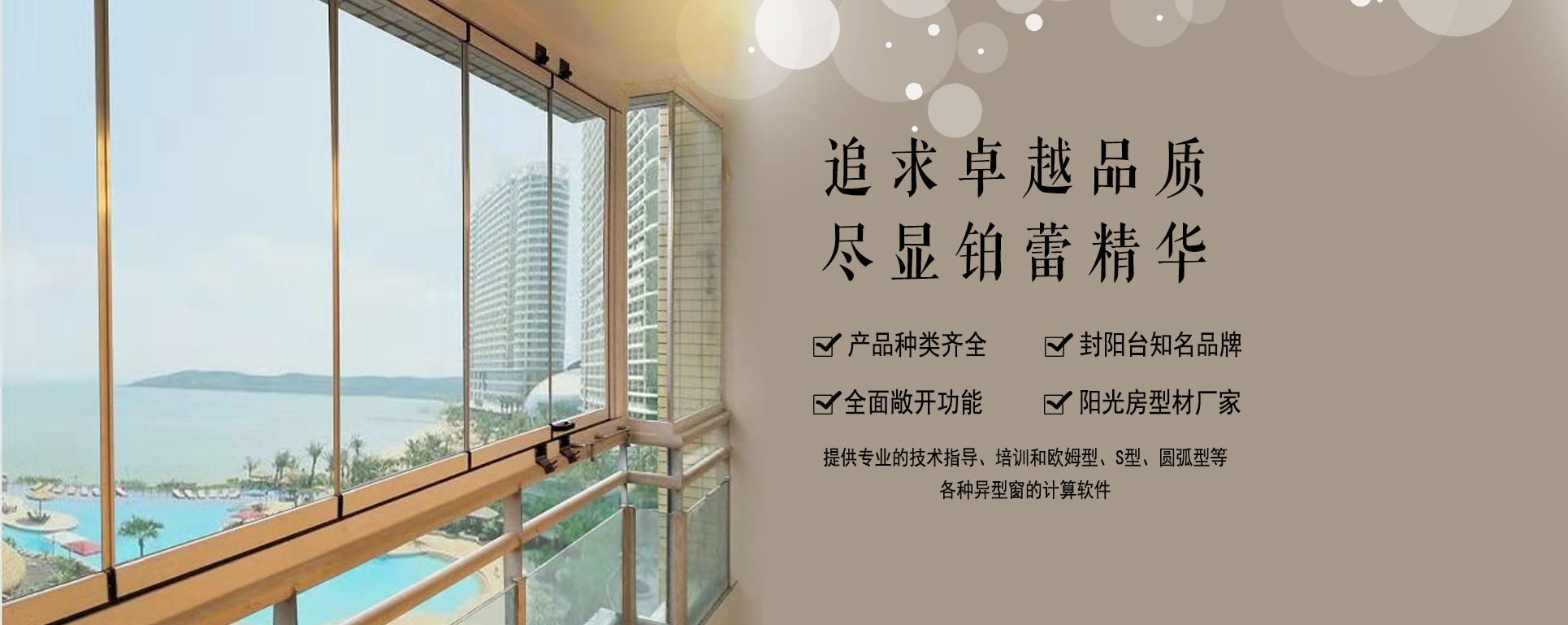 折疊門窗 本公司是一家專業生產 無框陽臺窗 , 折疊門 , 隔斷門 ,鋁合金門窗鋁型材及配件的企業,本公司專注 封陽臺 而開發各種 封閉陽臺 的產品,擁有整套完善的生產設備,集設計開模、型材生產、配件生產于一體,產品種類齊全的 門窗廠家 。設計人員結合 門窗安裝 和使用的實踐經驗,不斷設計開發新型的陽臺窗型材,滿足全國各地不同陽臺形狀,各種 陽臺設計 的需求,為 陽臺裝修 提供完美的方案。2006年開發出無框陽臺...[MORE +]